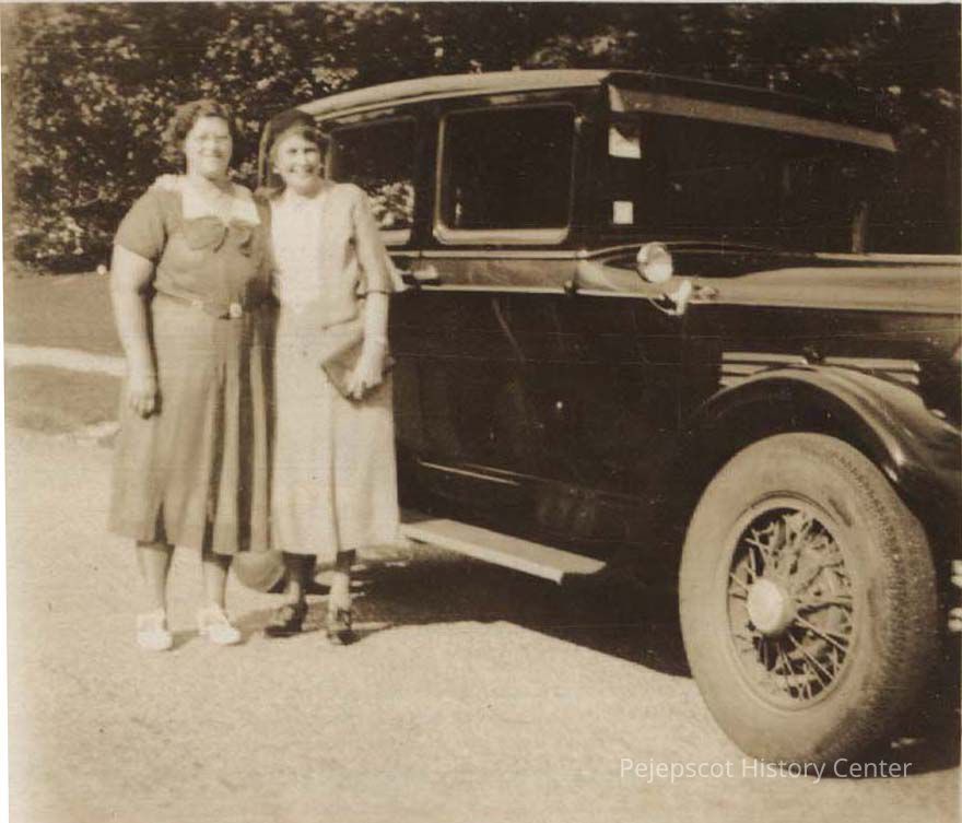 A photo of two women standing by a car. Marked on the back, "1933." Undated