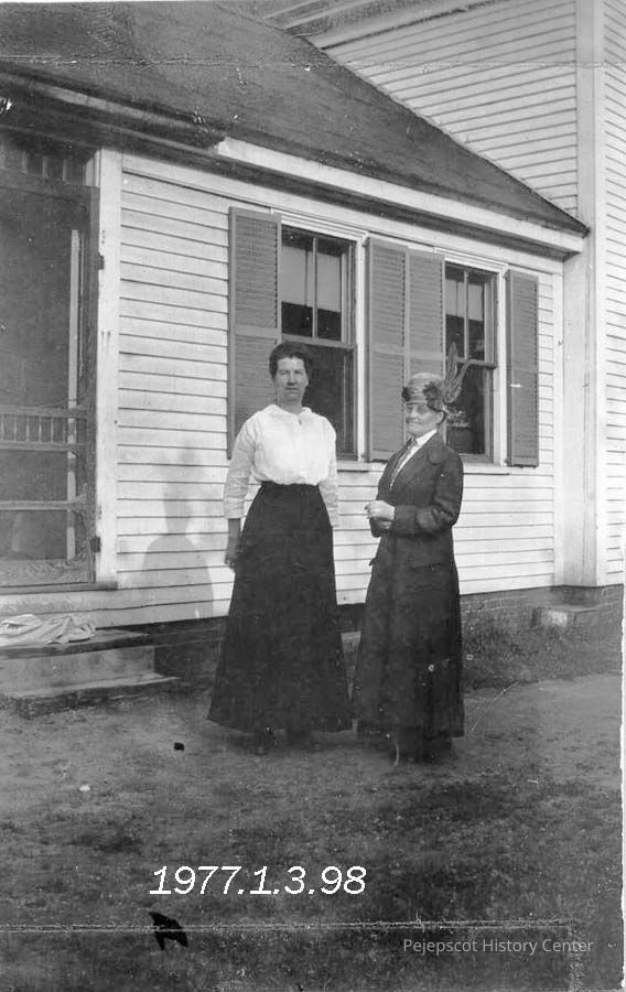 A B/W photograph of two women standing in front of a building. Annie Sylvester Carleton is the one on the left. Undated