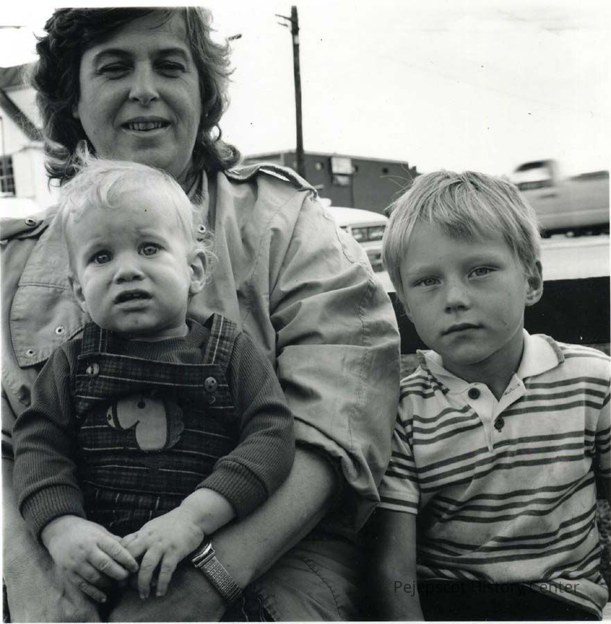 An undated black and white photograph of Twyla Greene of Freeport, Maine, and two children.