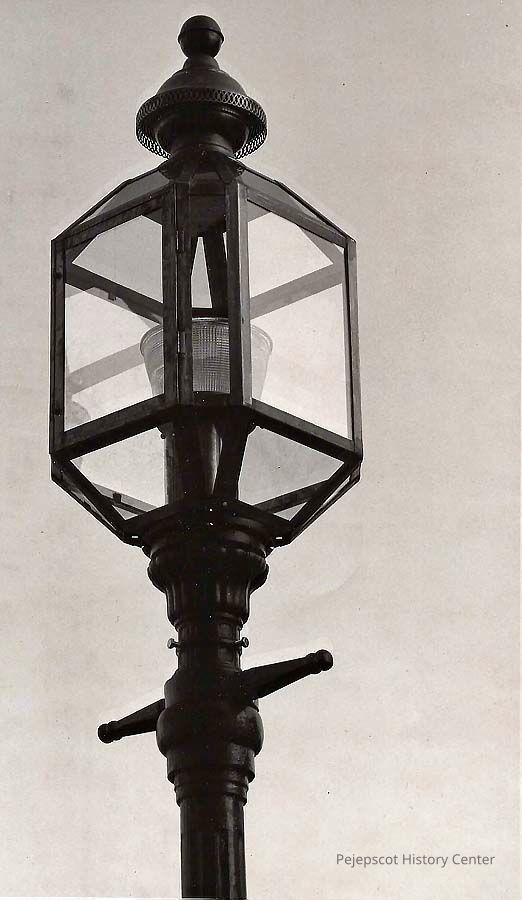 A B/W photograph of a light which is typical of the lights lining Maine Street in 2018. Undated