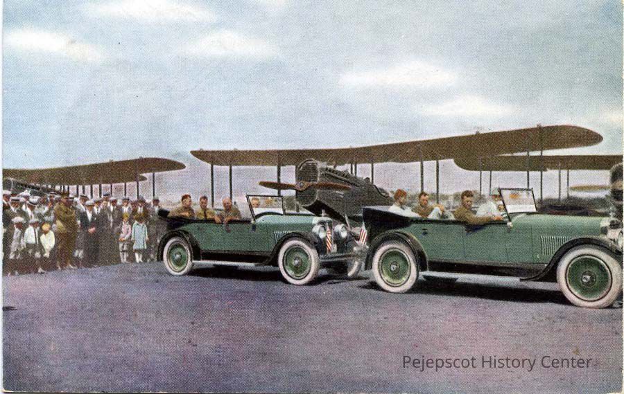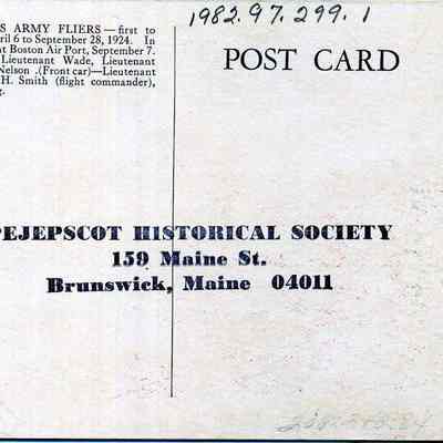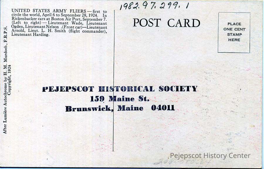 Color postcard of the U.S. Army Fliers, first to circle the world, April 6 to September 28, 1924. In Rickenbacker cars at Boston Airport, September 7. Left to Right: Lt. Wade, Lt. Ogden, Lt. Nelson. Front car: Lt. Arnold, Lt. L. H. Smith (flight commander), Lt. Harding.Lexicon