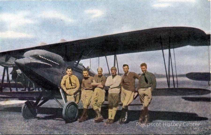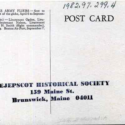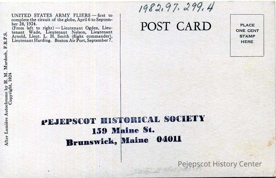 Color postcard of the U.S. Army Fliers, first to circle the world, April 6 to September 28, 1924. At Boston Airport, September 7. Left to Right: Lt. Ogden, Lt. Wade, Lt. Nelson, Lt. Arnold, Lt. L. H. Smith (flight commander), Lt. Harding.Lexicon