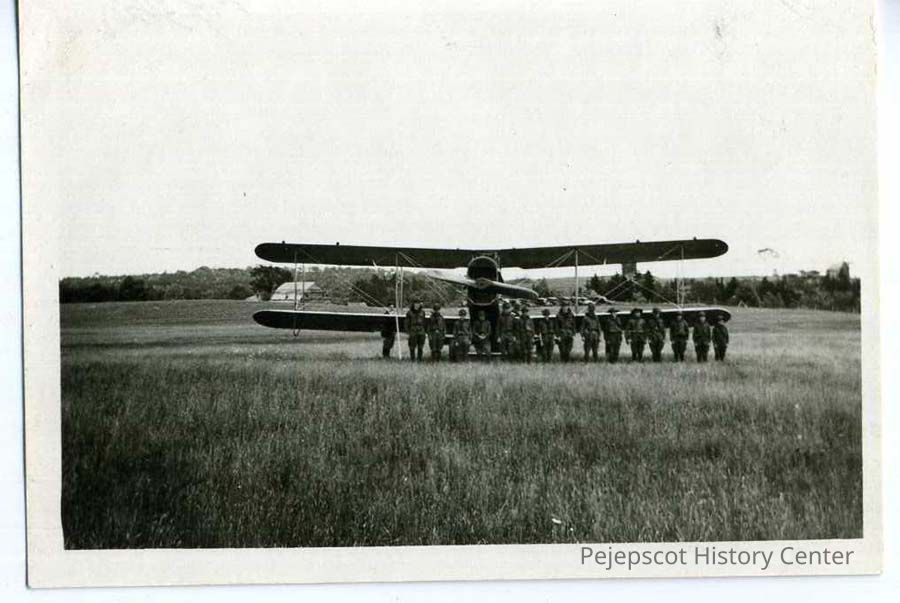B/W photo of distant shot of U.S. Army Fliers at Mere Point landing area.