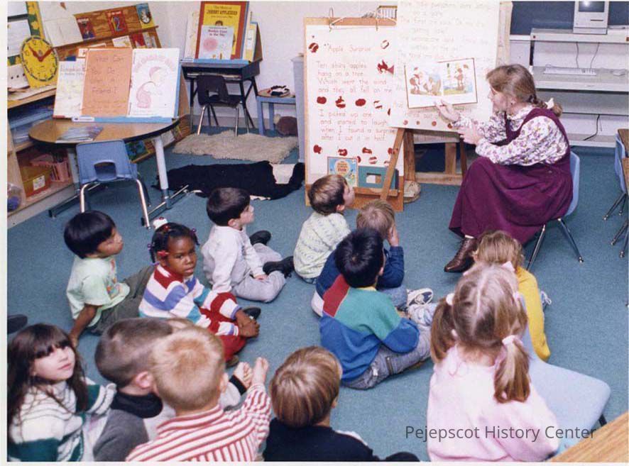 A color photograph of an unknown teacher and children in a classroom in Topsham, Maine, is dated 10/17/1991.