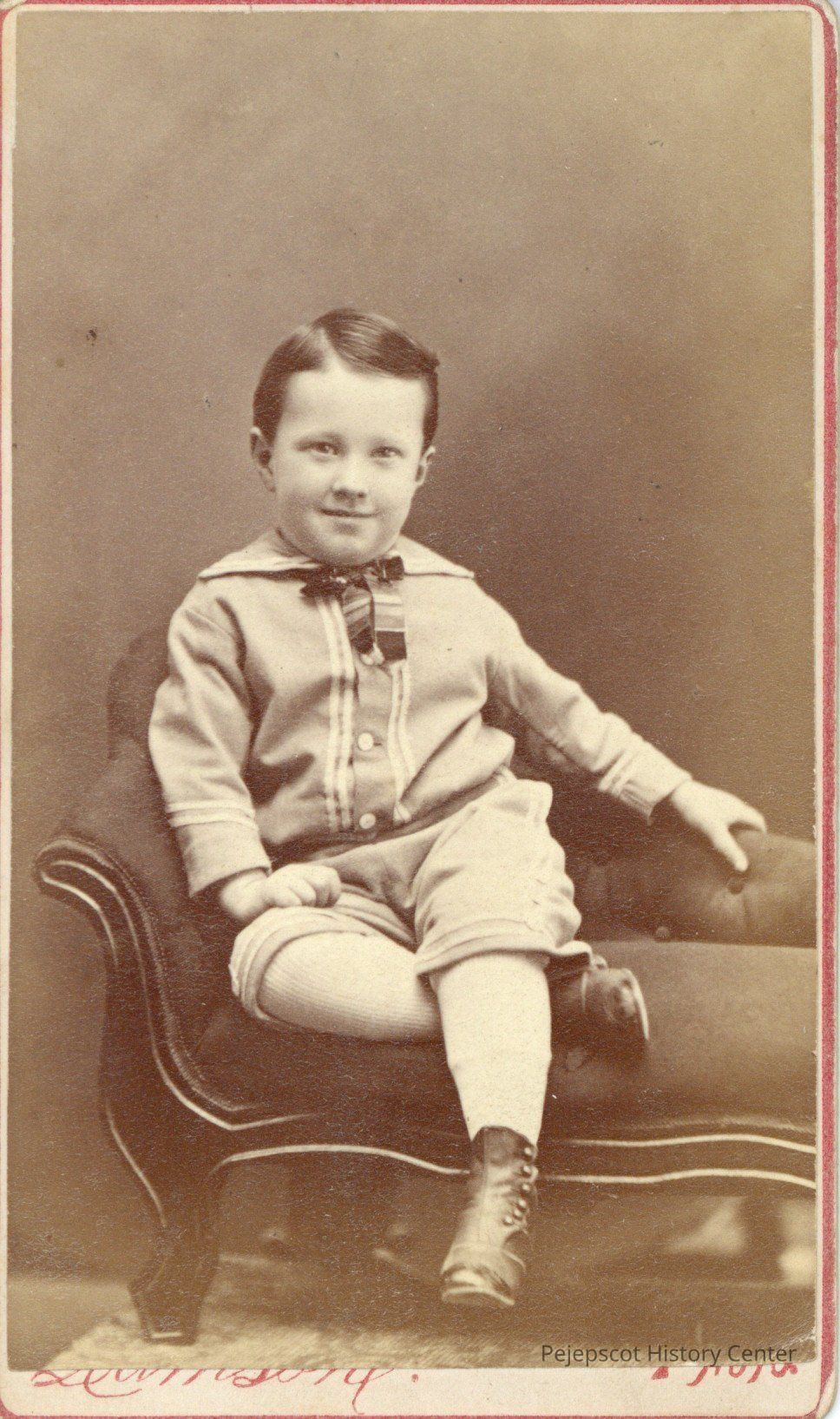 Portrait of a young boy wearing a suit, stockings and boots, seated on a couch.