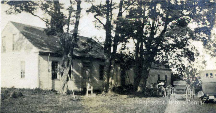 A B/W photo of some buildings. There are buggies and an automobile in the photo.