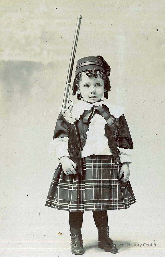 A B/W photograph of an unknown little girl with a big gun.