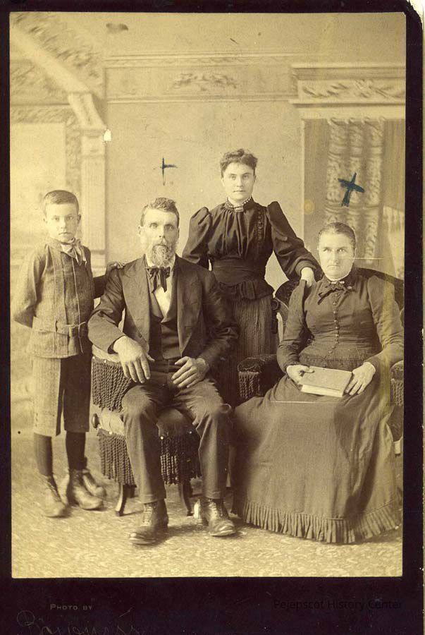 Sepia-toned photograph of unidentified boy, man and 2 women.