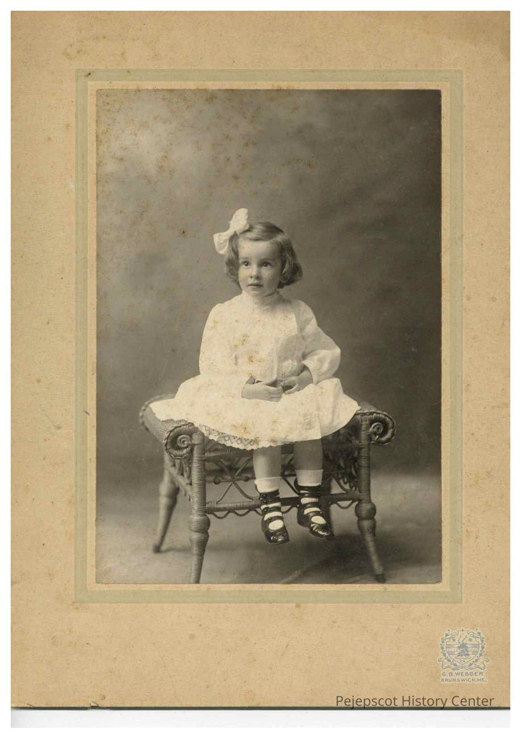 A photo of an unidentified girl sitting down, attached to a paperboard card