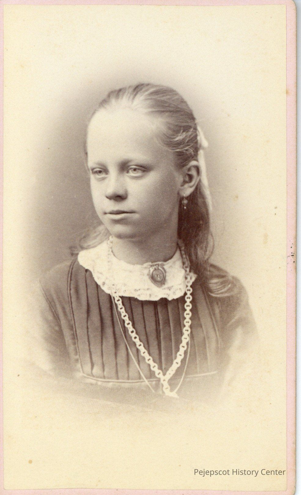 Portrait of a girl with long hair wearing a dress with a lace collar and jewelry.