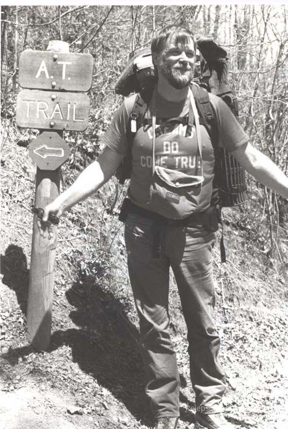 A undated black and white photo of an unidentified hiker who is standing near a sign that reads "A. T. Trail". [Appalachian Trail]