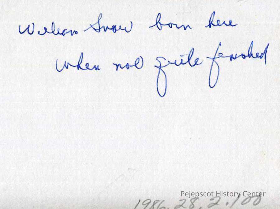 A B/W photographic view of an unknown house in Harpswell. A handwritten note on the photo says that William (?) Snow was born here.