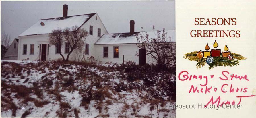 A B/W photographic view of a house which has been made part of a greeting card. Its is signed Ginny & Steve, Nick & Chris Minot