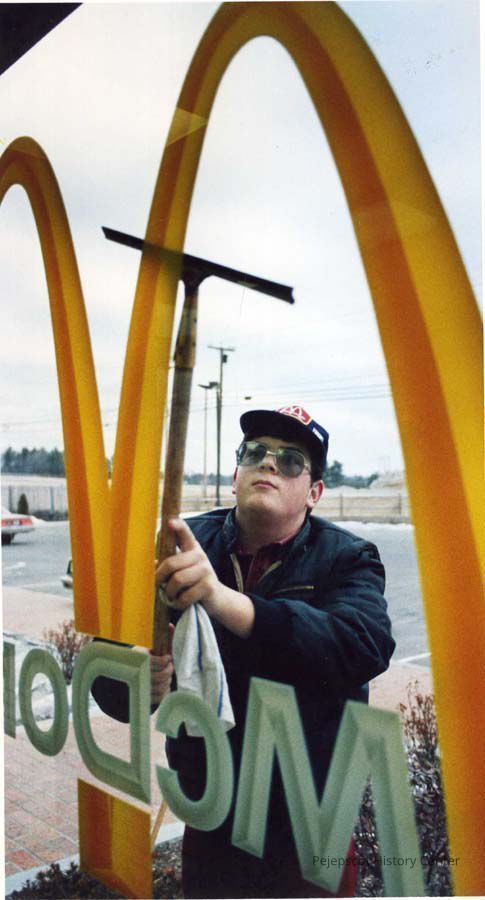 A color photograph of an unidentified man cleaning windows at the McDonald's in Topsham, Maine, is dated 12/30/1986