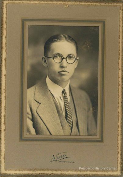 Studio photographic portrait of an unidentified young man wearing round glasses, set in a folding paper frame.