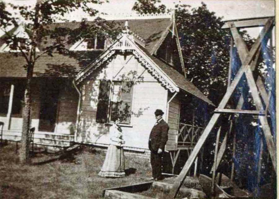An undated B/W photo of two unidentified people standing in front of a house. Undated