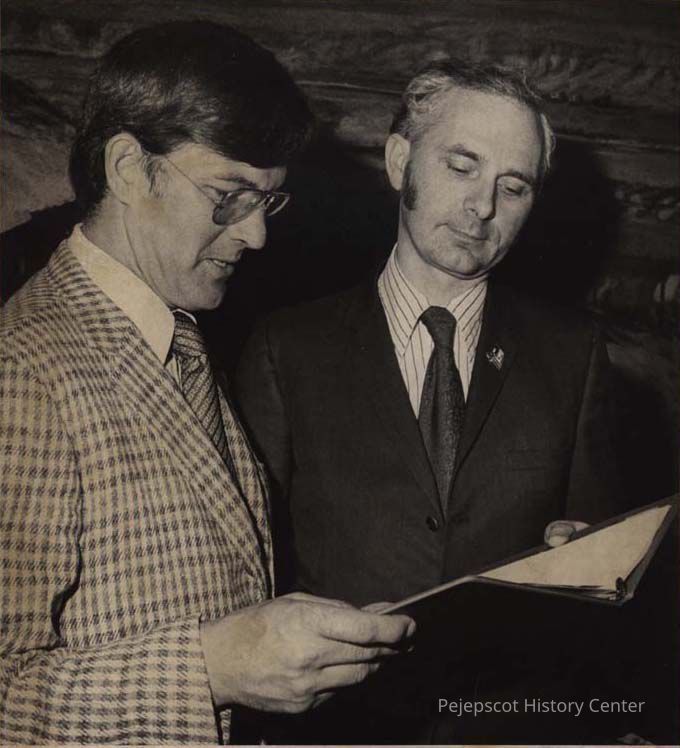 A black and white photo of an unidentified man at left and Lindon Christie, principal of Mt. Ararat High School. The photo was taken in 1978.