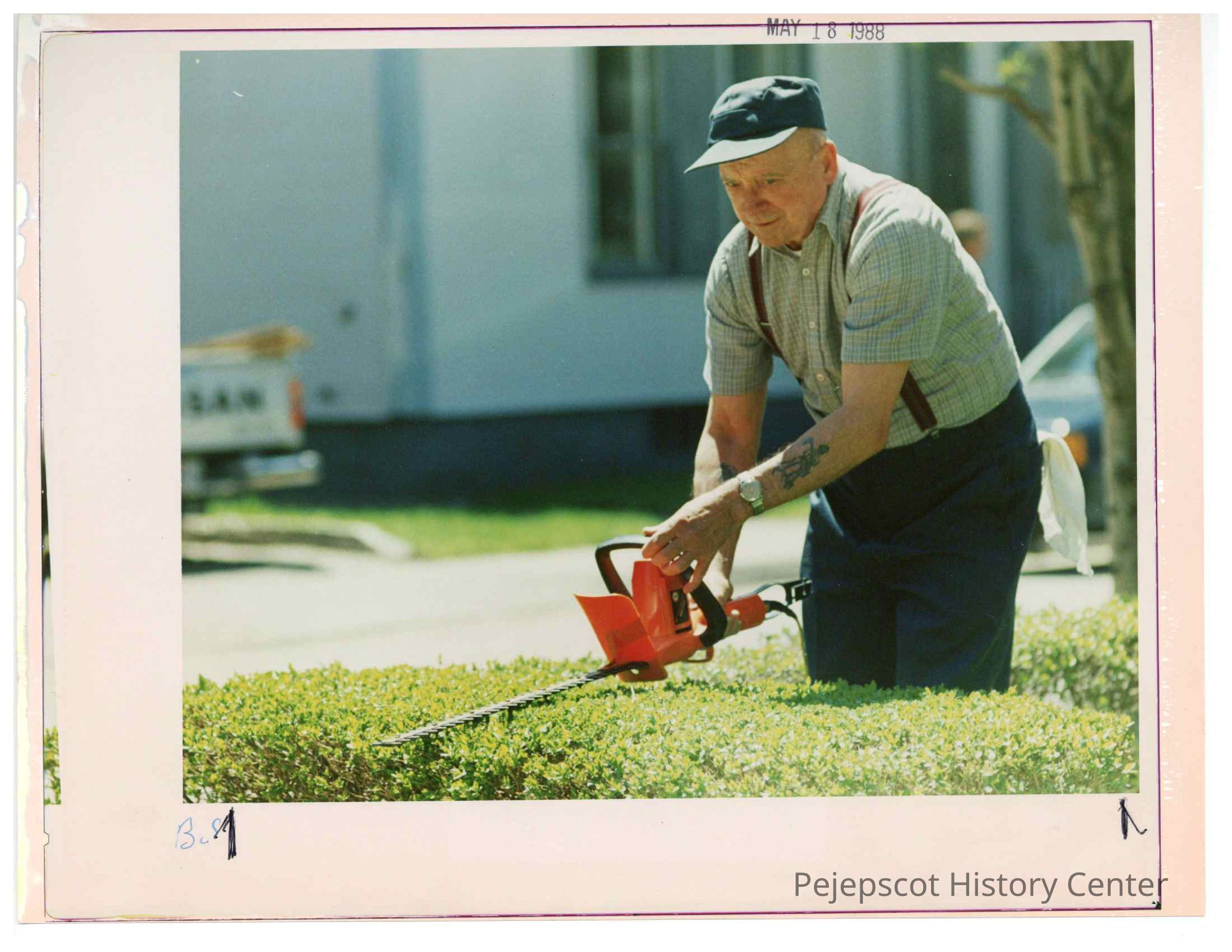 A color photograph of a man trimming a hedge. This photo was published in the Times Record 5/18/1988.