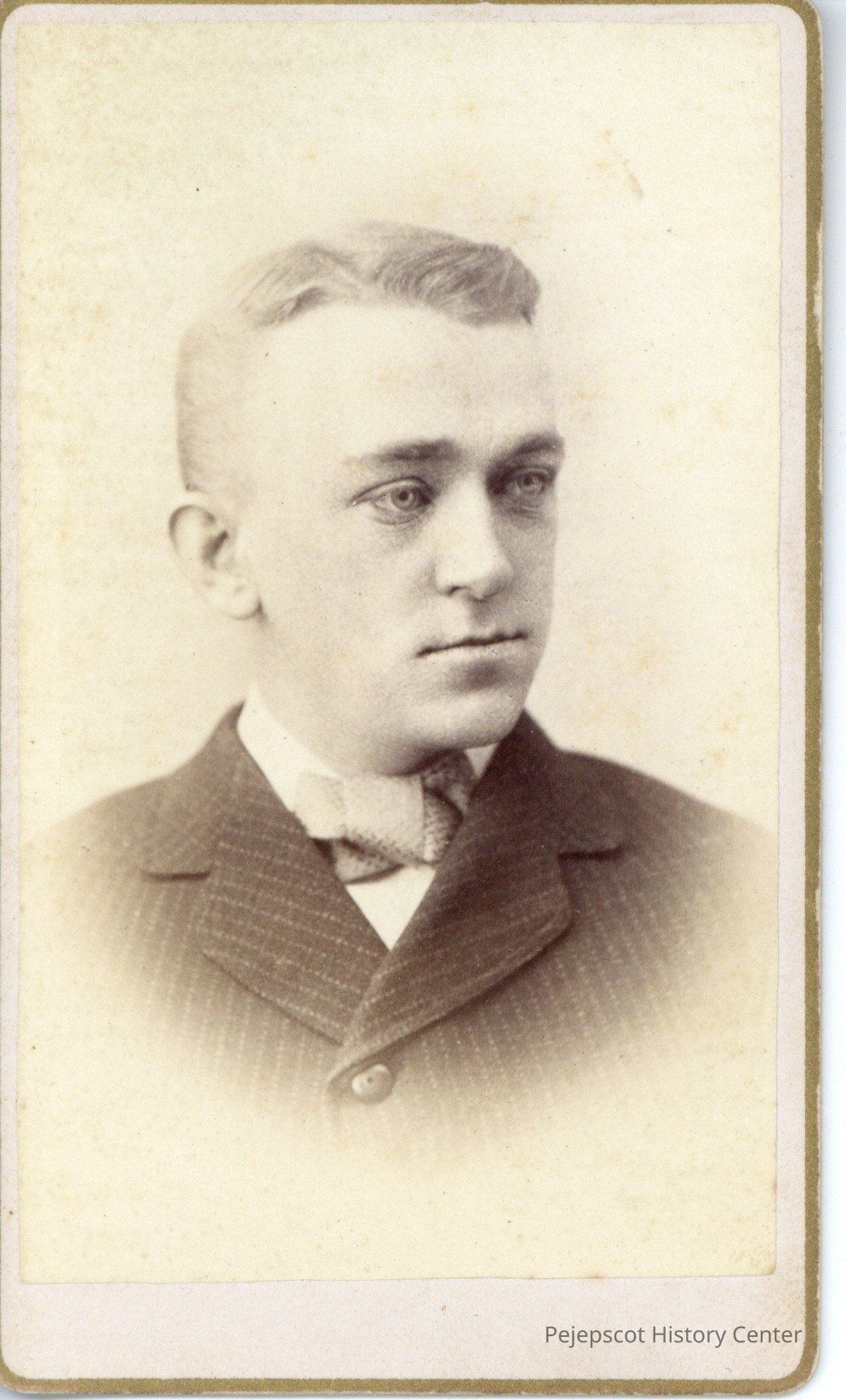 Portrait of a man wearing a striped jacket, collared shirt and bow tie.