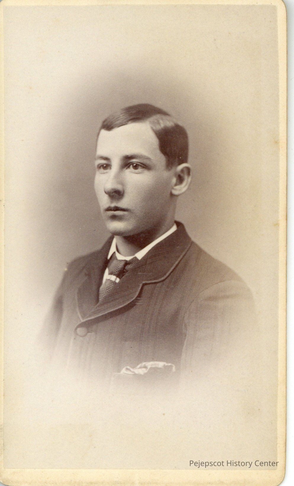 Portrait of a man wearing a collared shirt, tie and buttoned coat with handkerchief in breast pocket.