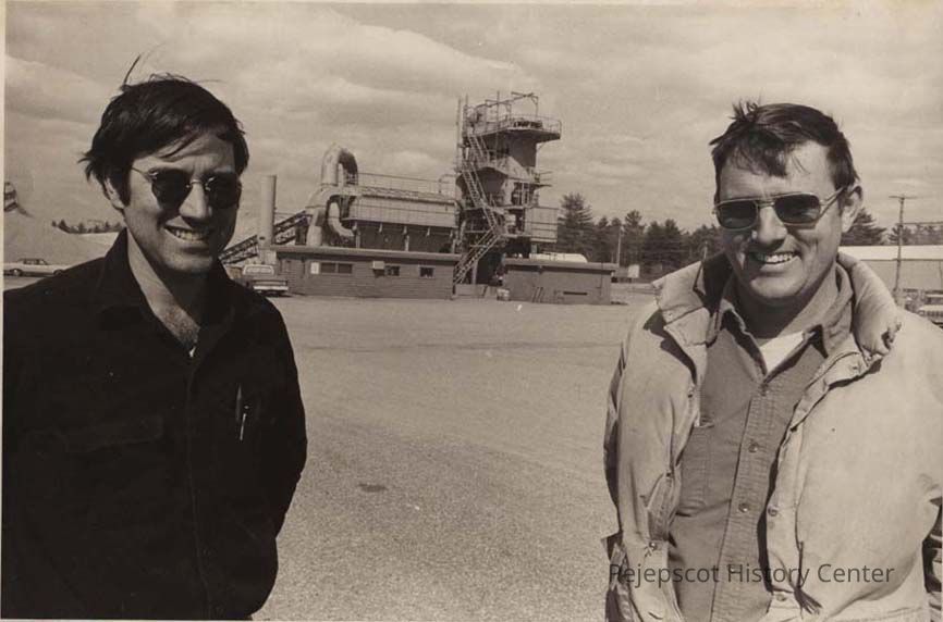 A black and white photograph of two unidentified men standing in front of the Crooker plant in Topsham, was published in The Times Record in Brunswick, Maine, on 4/19/1979.