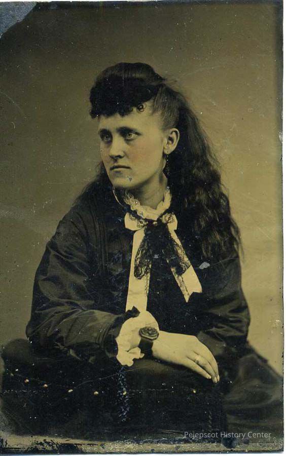 Black & white tin type photograph of an unidentified long haired woman who was a member of the Mountfort family. It was originally mounted in the center pages of a family bible. Undated.