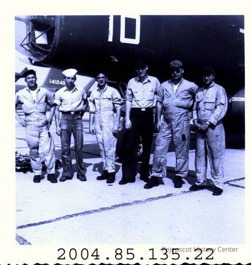 A small B/W photograph of six unidentified men posing in front of a plane. Brunswick Naval Air Station
