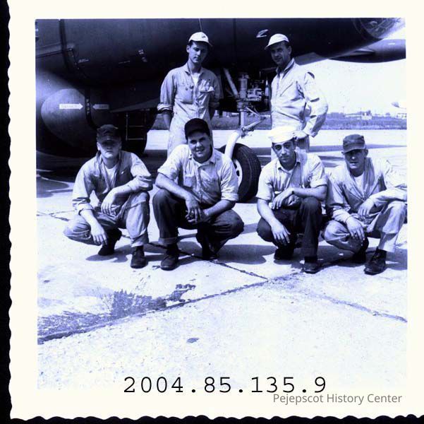 A small B/W photograph of six unidentified men under a wing of a plane. Brunswick Naval Air Station H 909