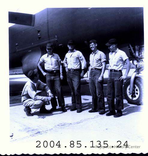A small B/W photograph of 5 unidentified men. Four are standing and one kneeling. They are in uniform and are beside a plane. Brunswick Naval Air Station
