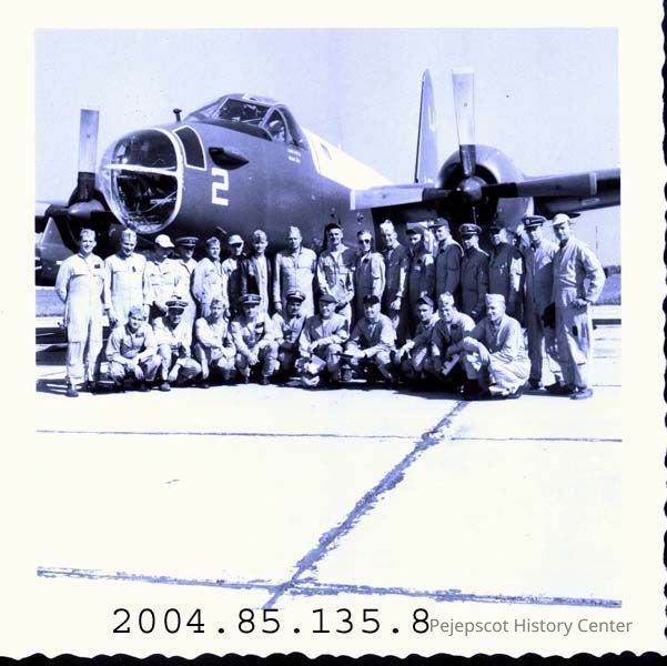 A small B/W photograph of a large number of unidentified men posing in front of a plane. Brunswick Naval Air Station H 913