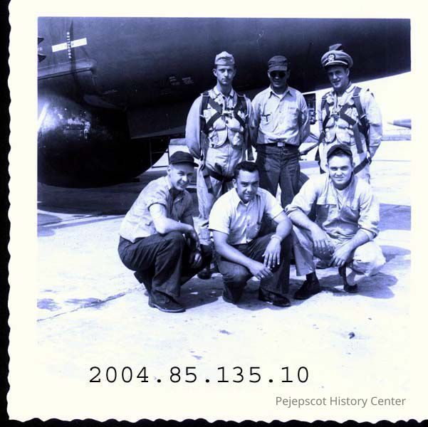 A small B/W photograph of 6 unidentified men near a plane. Some are in flight gear. Brunswick Naval Air Station