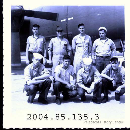 A small B/W photograph of eight Navy men posing in front of a plane. Brunswick Naval Air Station.