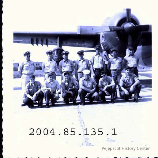 A small B/W photograph of 13 unidentified Navy men in front of a plane. Brunswick Naval Air Station. H 910