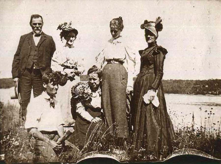 An undated B/W photo of six unidentified people standing on the beach. Undated