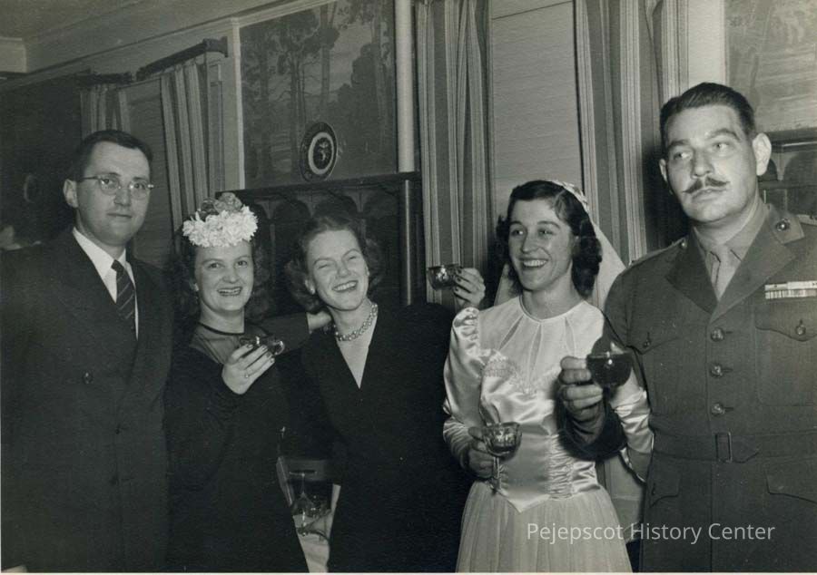 A black and white photograph of a group of people drinking a toast at the Chaisson and Martin wedding reception at the Hotel Eagle. 02/22/1946