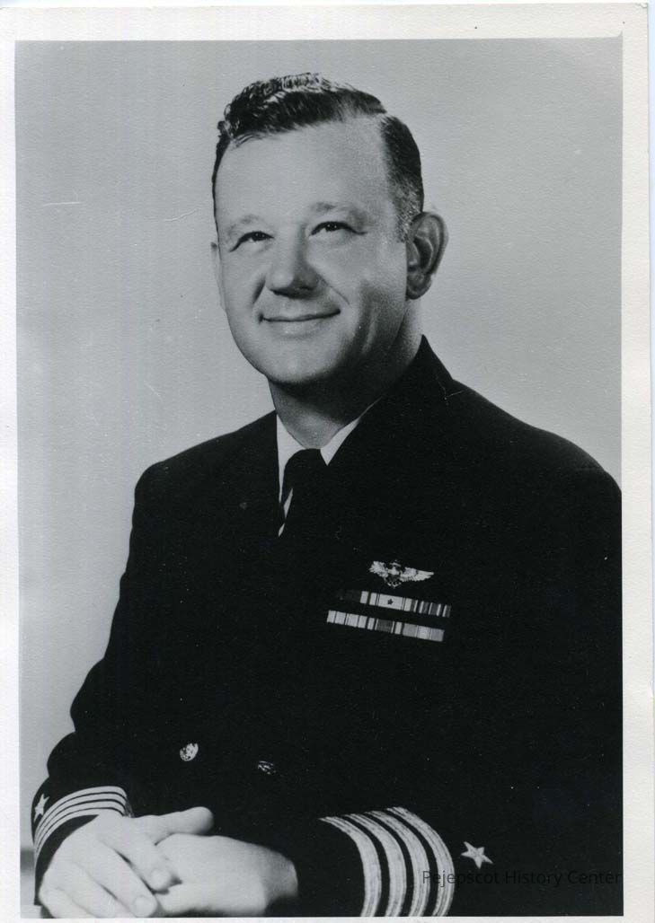 A waist up portrait of an unidentified Navy officer. He wears four strips at his wrists and two rows of ribbons on his chest. The single star on his sleeve indicates that he is a Rear Admiral. The back reads; "U.S. NAVY AIR STATION BRUNSWICK, MAINE" "RELEASED if published credit must be given as follows ' official photograph of the U.S. Navy'" Undated