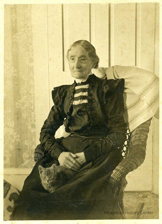 An undated black and white photograph of an unidentified elderly Stover woman sitting on a wicker rocking chair with a cat on her lap.