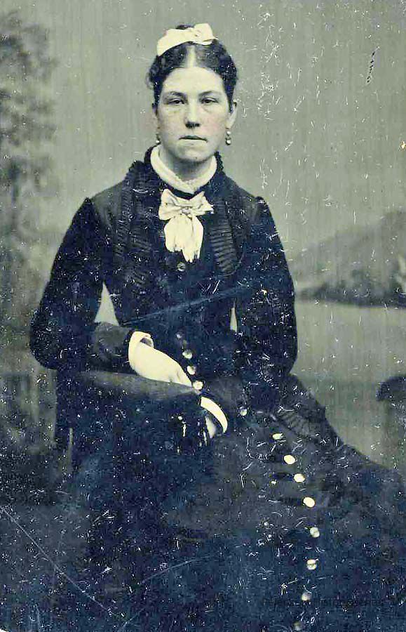 A B/W portrait photograph of an unknown woman seated in front of a nature scene. Undated.