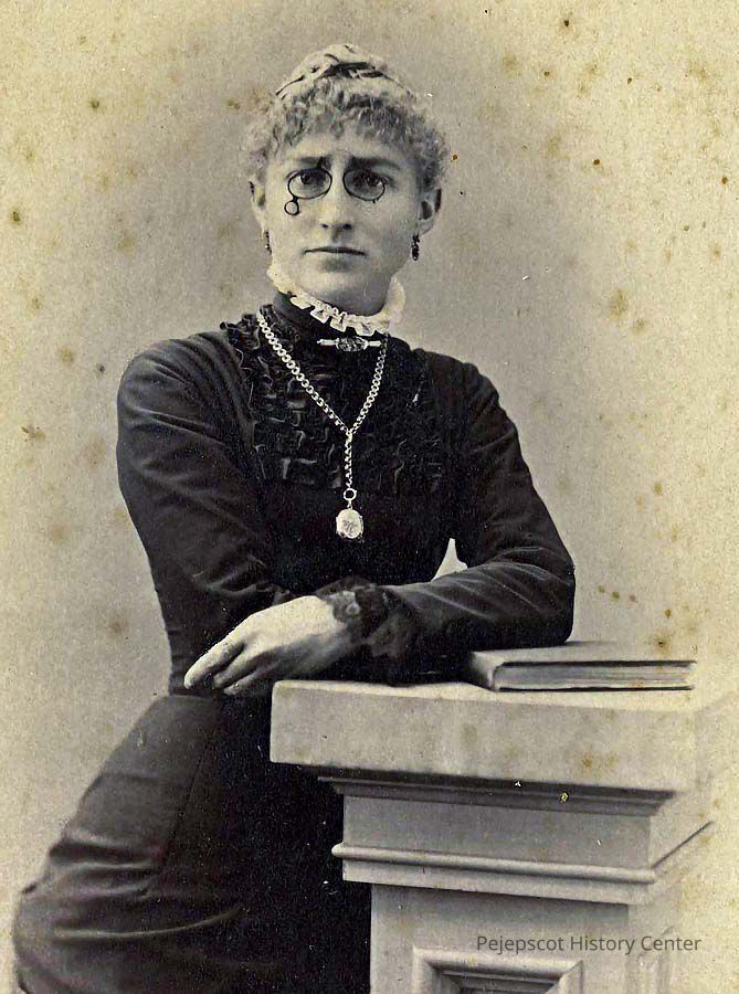 A black and white photograph of an unknown woman with uniquely shaped eyeglasses. No date.