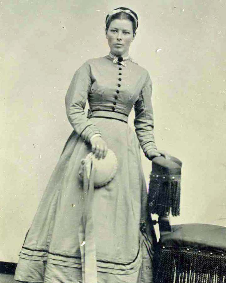 A B/W photograph of an unknown woman holding her bonnet. Undated.