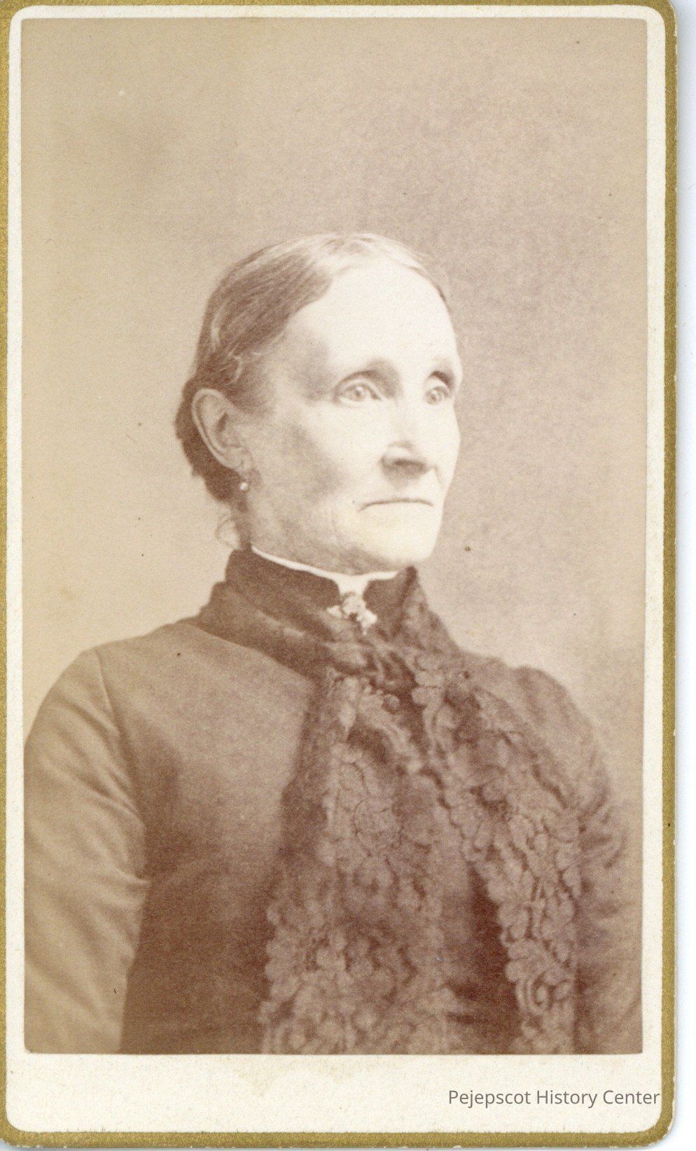 Portrait of an older woman wearing a collared dress and lace scarf.