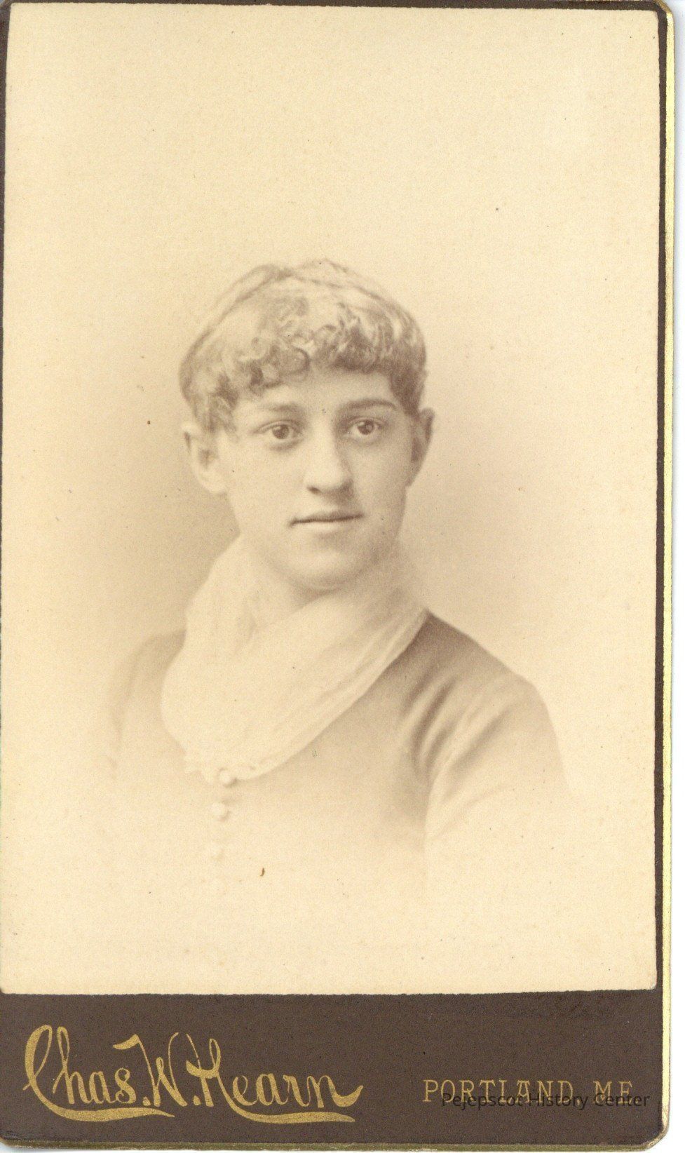 Portrait of a woman wearing a buttoned dress and scarf.