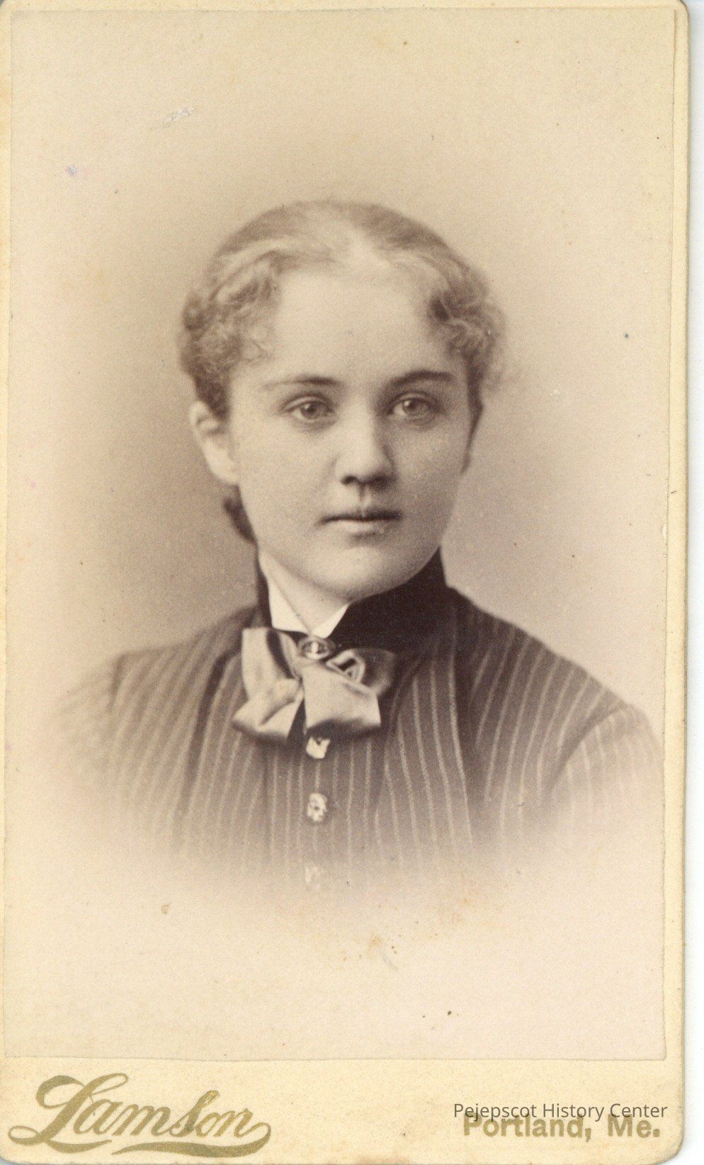 Portrait of a woman wearing a long sleeve button jacket with bow tie.