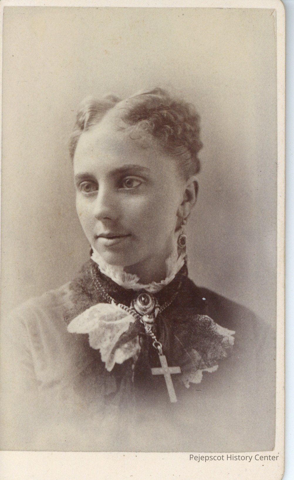 Portrait of a woman wearing lace collars and a cross necklace.