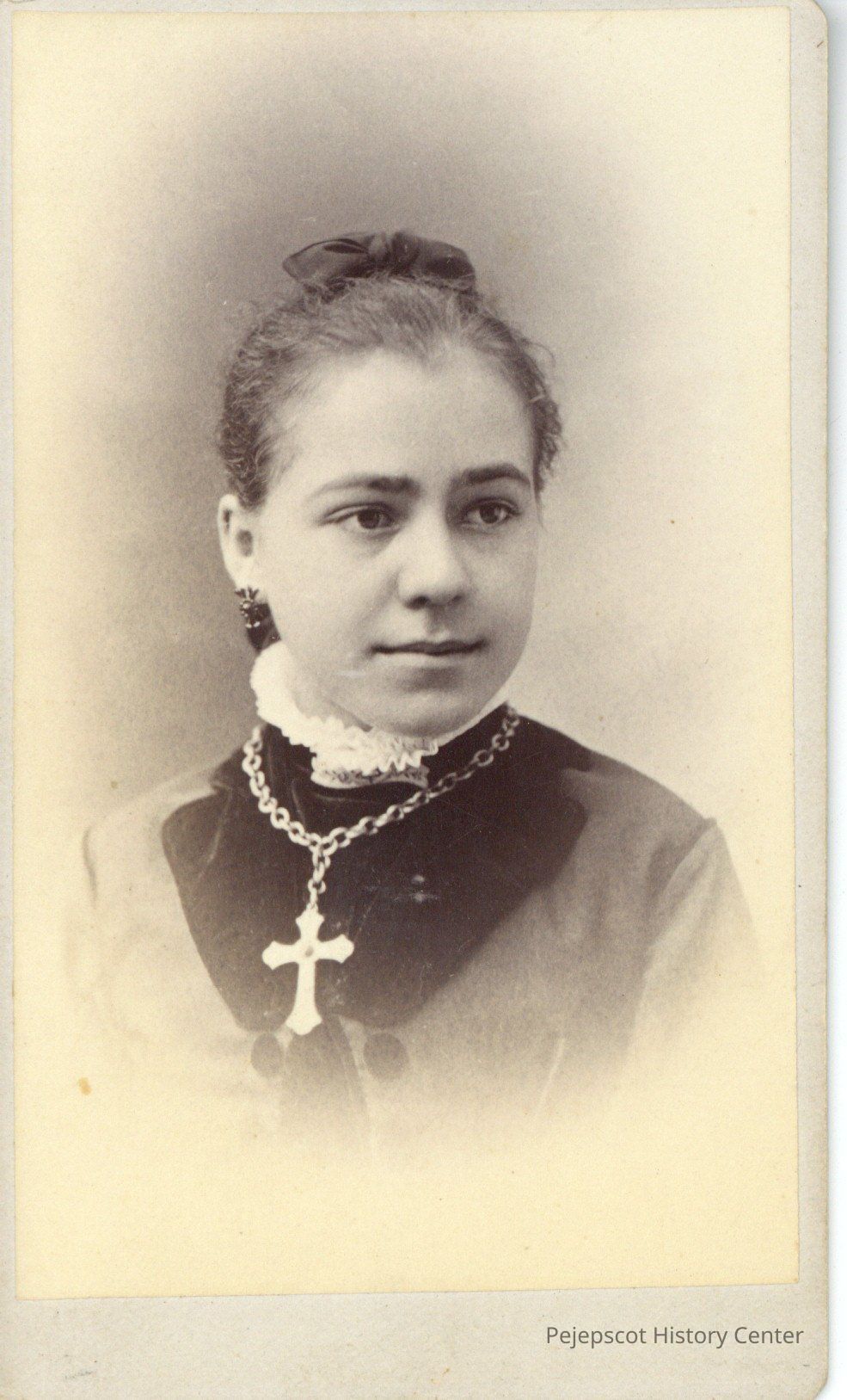 Portrait of a woman wearing a long sleeve garment with ornate collar and a cross necklace.