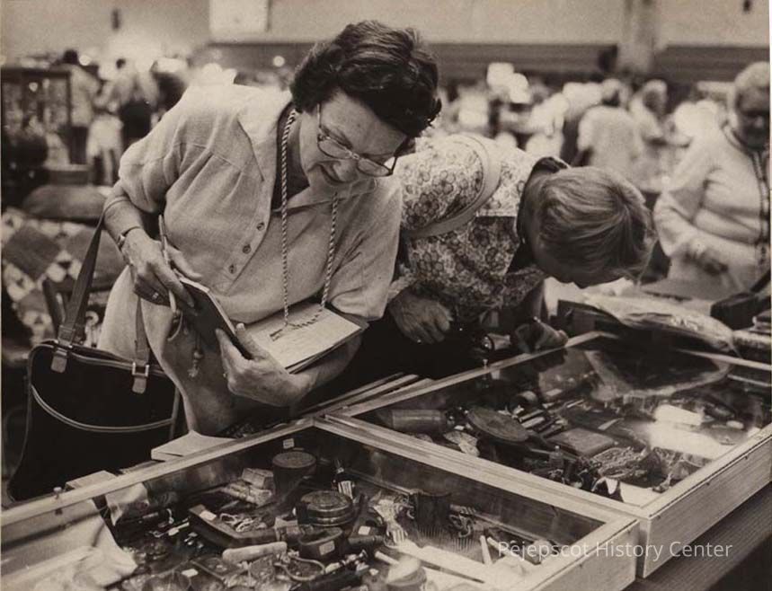 A black and white photo of unidentified woman examining items in display cases was published in The Times Record in Brunswick, Maine, on 8/9/1978.