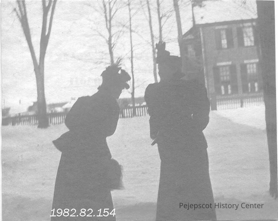 A B/W photograph of two unidentified ladies. The Parker Cleaveland House, 71 Federal Street, Brunswick, Maine can be seen in the background.Collection
