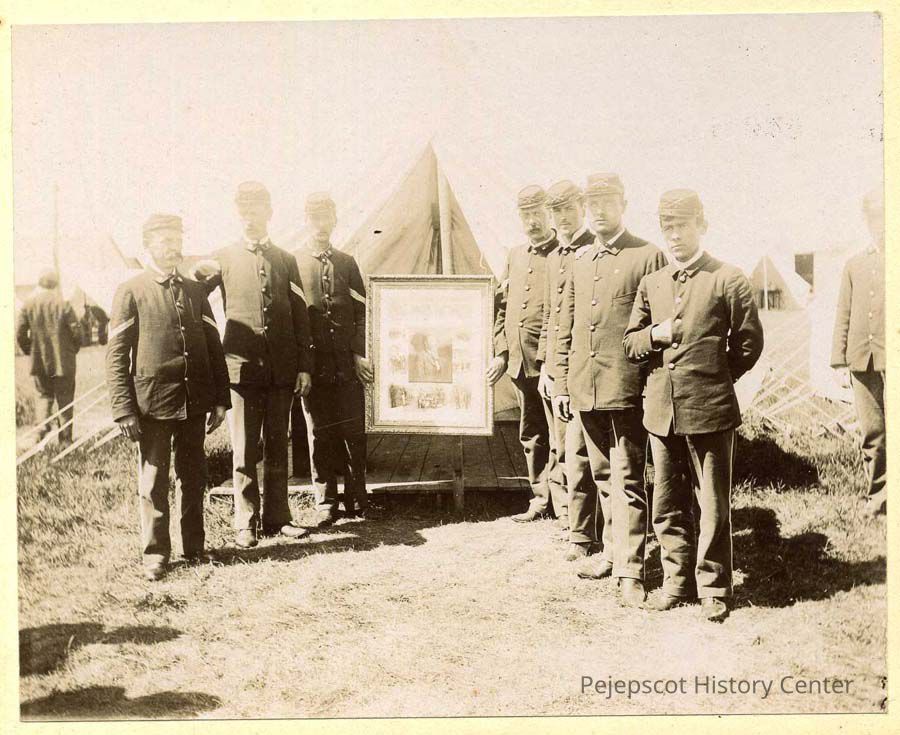 Seven soldiers with framed picture/plaque. Could be Union soldiers.