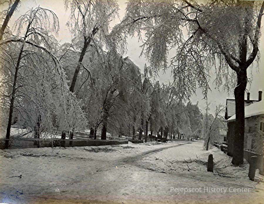 A B/W photo of Union Street, Brunswick, ME during an ice storm. The street is covered in snow and the ground is littered with downed branches. The trees are low with ice. Dated 1885.
