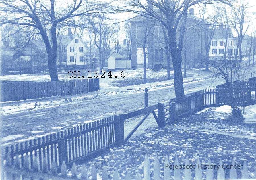 A B/W photograph of the Union Street School, Union Street, Brunswick, Maine. The photo appears to have been taken from Cumberland Street in winter. Dated 1898.